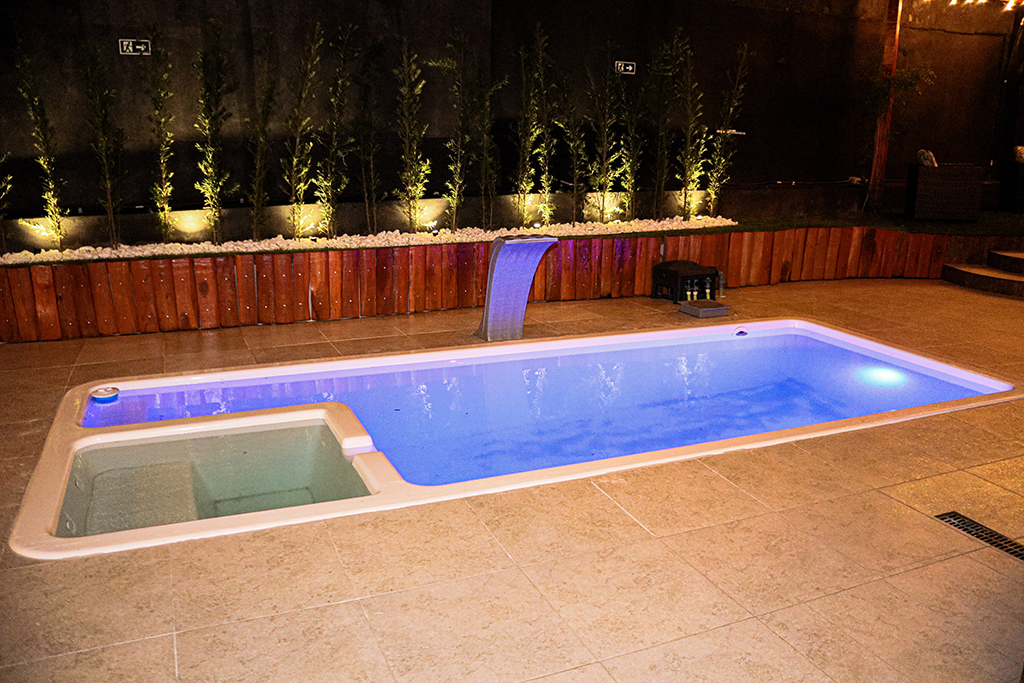 Piscina: com cascata, iluminação e jardim com pergolado e poltronas;